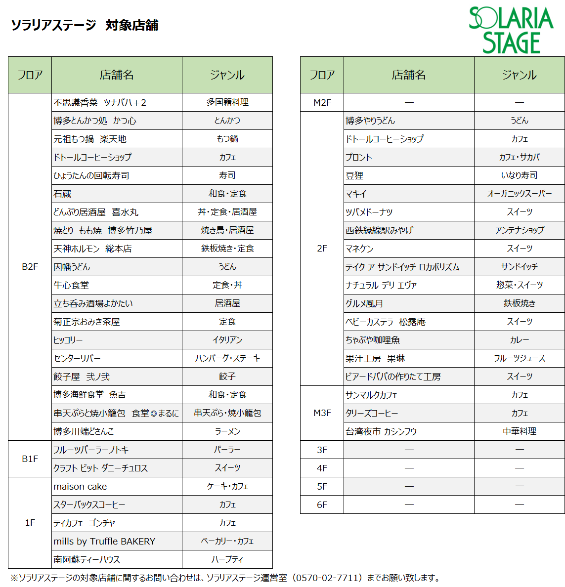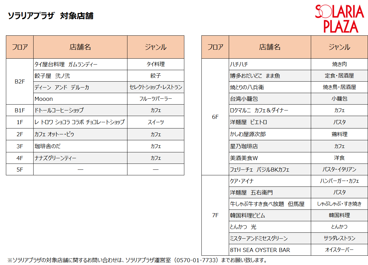 ・ソラリアプラザ・ソラリアステージの各対象店舗